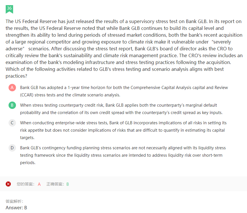 A选项意思是GLB银行对综合资本分析资本和审查(CCAR)压力测试和气候情景分析均采用了1年的期限,不能一概而论对所有审查使用一样的期限,要依据特征选择合适的期限;B选项在对交易对手信用风险进行压力测试时,GLB银行将交易对手的边际违约概率和自身信用利差与交易对手信用利差的相关性作为关键输入,是合理的做法