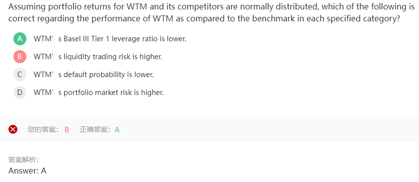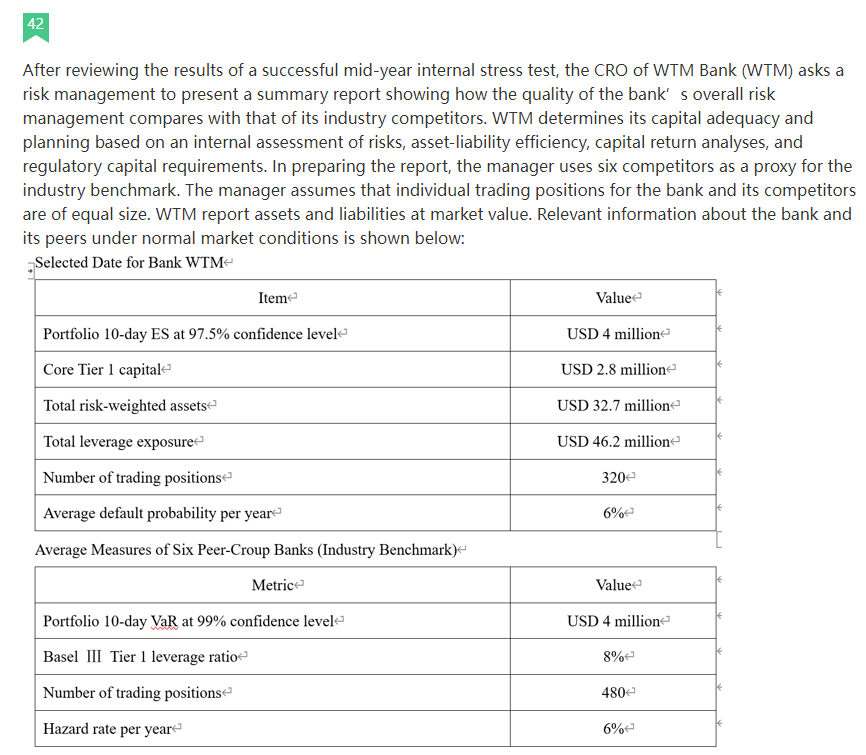 同学,leverage ratio是2.8/46.2;B选项依据交易头寸数额来判断;选项D market risk 可以依据ES和VAR指标数据来判断哈
