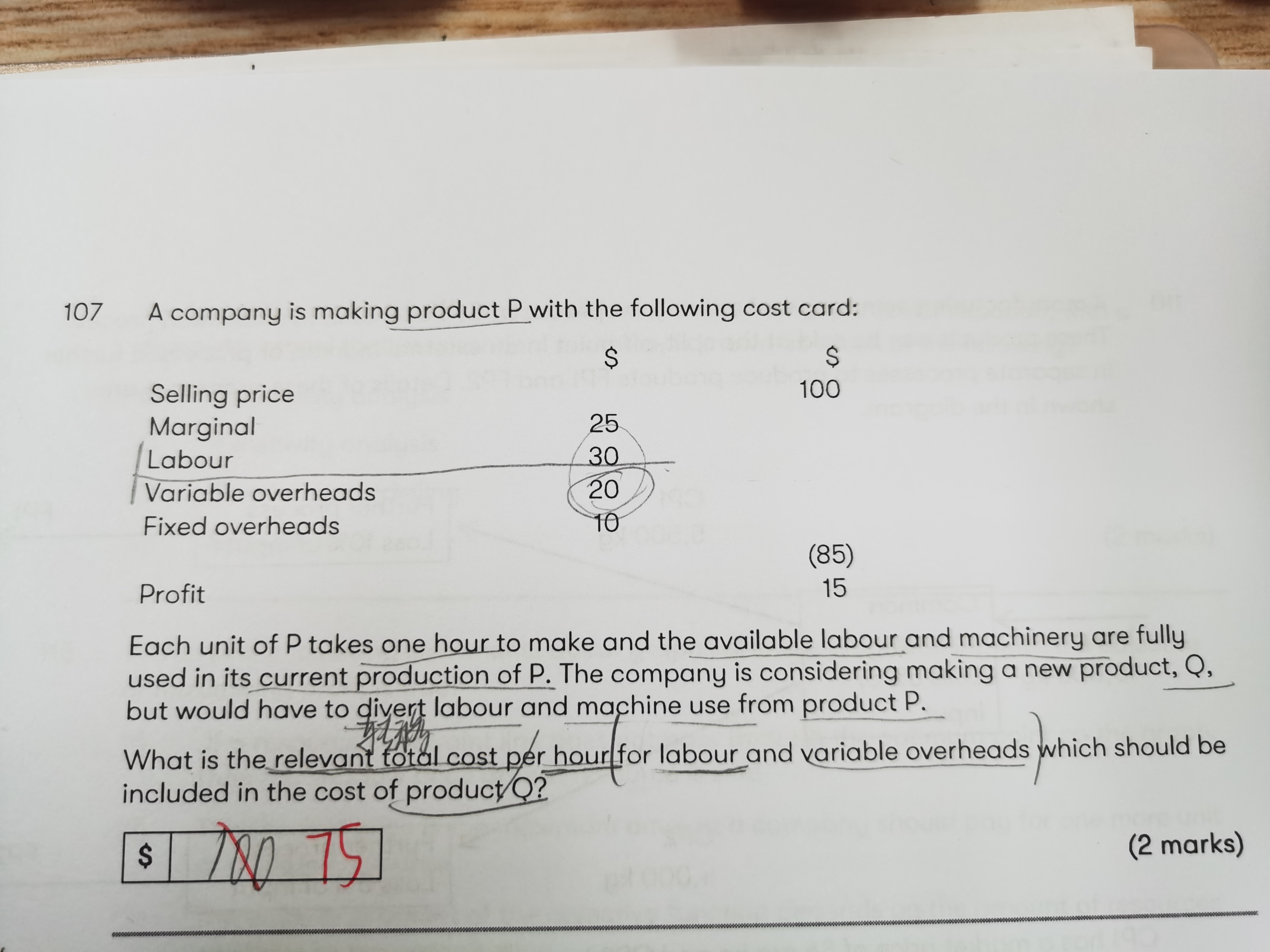 同学,由于现有的labour和machine都用来做P,如果要做Q就需要放弃做P,那么做Q的labour和VOH的相关成本就是机会成本加上labour和VOH,机会成本是放弃做P而丢掉的贡献contribution(100-25-30-20=25),labour和VOH(30+20=50),总共是25+50=75.