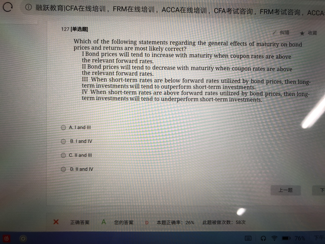 不是relevant forward rate,而是the relevant forward rate,相关的相对应的远期利率。 A是通过债券的定价公式计算得到的结论,如果你觉得记不住,那就定性的想,coupon rate高,期限越长,未来的现金流越多,而且forward rate低,意味着折现率低,所以期限越长,债券的的价格越高。 D短期利率高,bond price是低的,长期利率低,债券的价格高啊 underperform错了