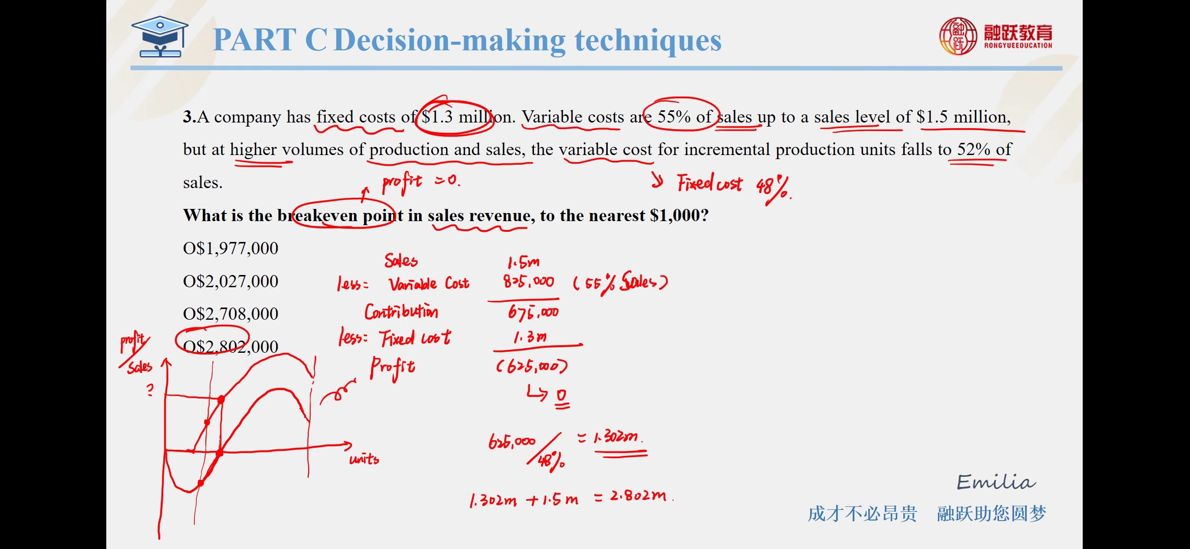 同学,因为VC是52%sales是跟着销售量来走的,那么如何去cover掉625000,只能通过FC来cover,FC是48%sales,那么sales就是625000/48%就算出销售量。