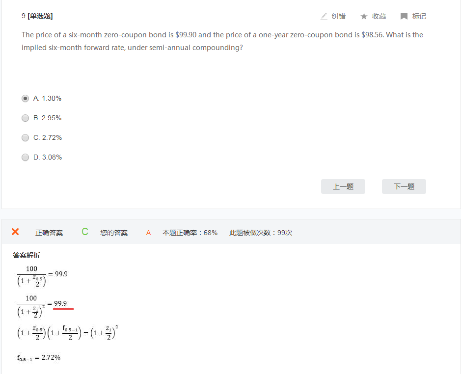 同学,你仔细看题目了吗????? 题目要你求6个月的利率, 给你了6个月的零息债,和12个月的零息债; 你用哪个值计算? 你还是好好看一下书本基础知识吧,这样子没有达到考试要求