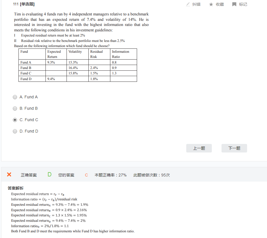 这题考查的就是信息比率的计算公式 IR=(expected residual return)/residual risk=(expected return-risk free rate )/residual risk,颠过来倒过去的算,然后选出信息比率且residual risk小于2 的那个基金