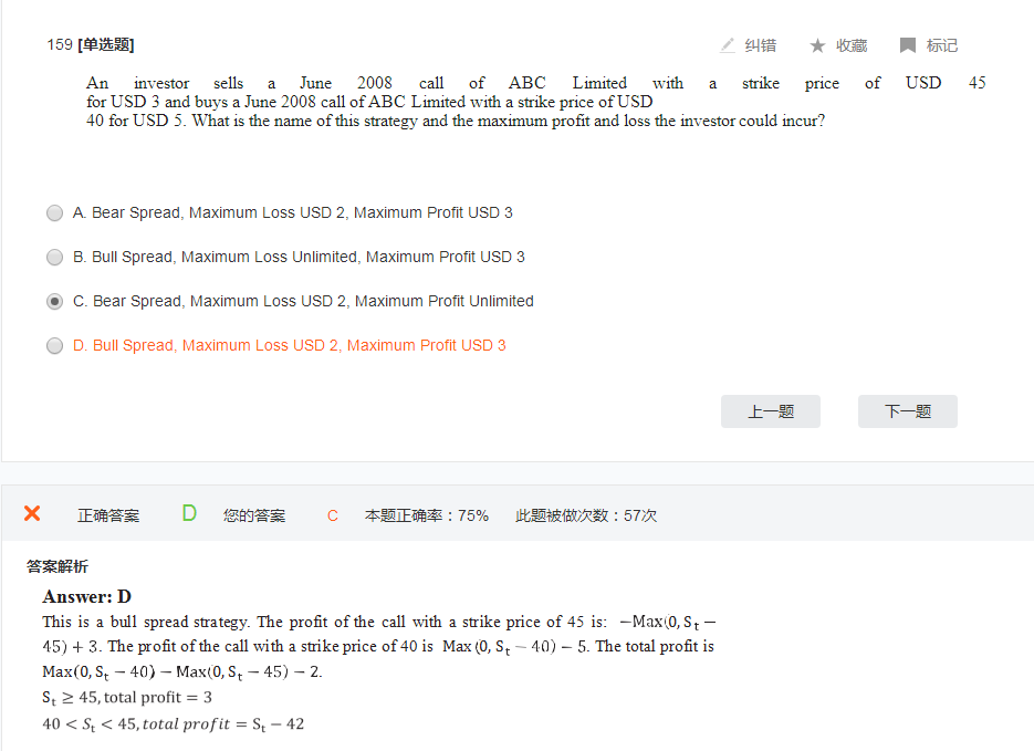同学,Bull spread这个组合就是由买一个行权价格低得看涨期权和卖一个行权价格高的看涨期权组成; 最大盈利点和最大亏损点分别在行权价格为45和 40的时候;你可以分别带数值算一下