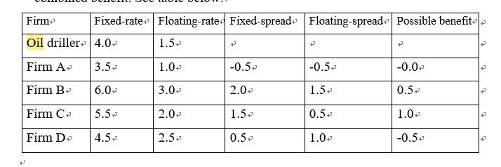 其实就是相减的过程,看看哪个差最大。 ABCD的fixed 和floating都分别减去Oil driller的,得到的就是每个公司在fixed和floating的相对优势。