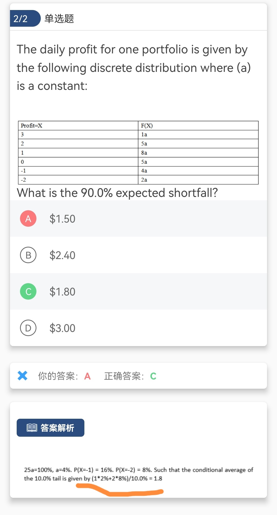 因为求出来a=4%,题目问的是90%的置信水平,同时是离散的分布。所以损失为2对应的是8%,累积到10%就截止了,所以损失为1其实只有2%,这里面求均值就应该用加权平均的思想,不能求算术平均,因为算术平均假定的是等权重,但是在10%的显著性水平中,有8%来自损失2,2%来自损失1
