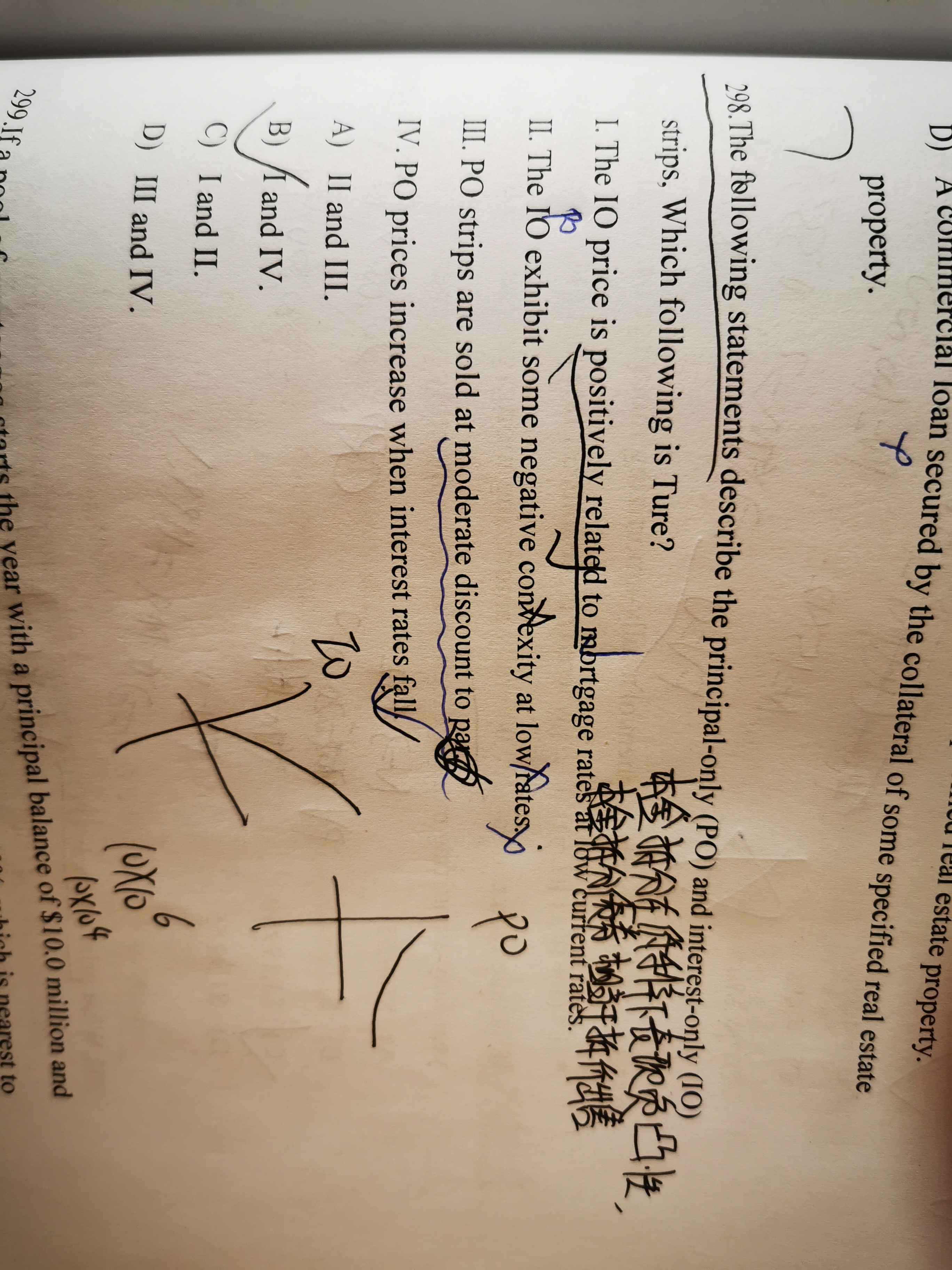 PO和IO是由房屋抵押债券拆分出来的本金债券和利息债券;I这个说法,interest-only在贷款利率低的时候是一个正相关的关系;这个说法没问题,因为在购买的时候的房屋贷款是更具房贷的利率计算的,如果房贷利率比较低,市场的基准利率比较高那么就不会发生提前还款,如果房贷利率非常高,如果市场利率下跌小于房贷利率,那么这个时候就会发生提前还款,这个时候本金就少了,利息债券的价值也就小了;II说的是在低利率的时候利息债券有一个负凸性,这个负凸性是principle only的性质,不对;III principal-only 一般都是折价发行;这里有两种解释1.期限长的po一般是按折价发行,如果期限短的流动性好的po有一个流动性溢价定价的时候就可能高于par;2.这个解释偏实物了,就是说po是由第三方债券发行的,所以会赚一个发行费用,所以最后卖给投资者的价格也会高于par; IV principal-only会随着利率下降价格上升,这里是因为PO可以看成一个零息债券,利率下降债券价格上升