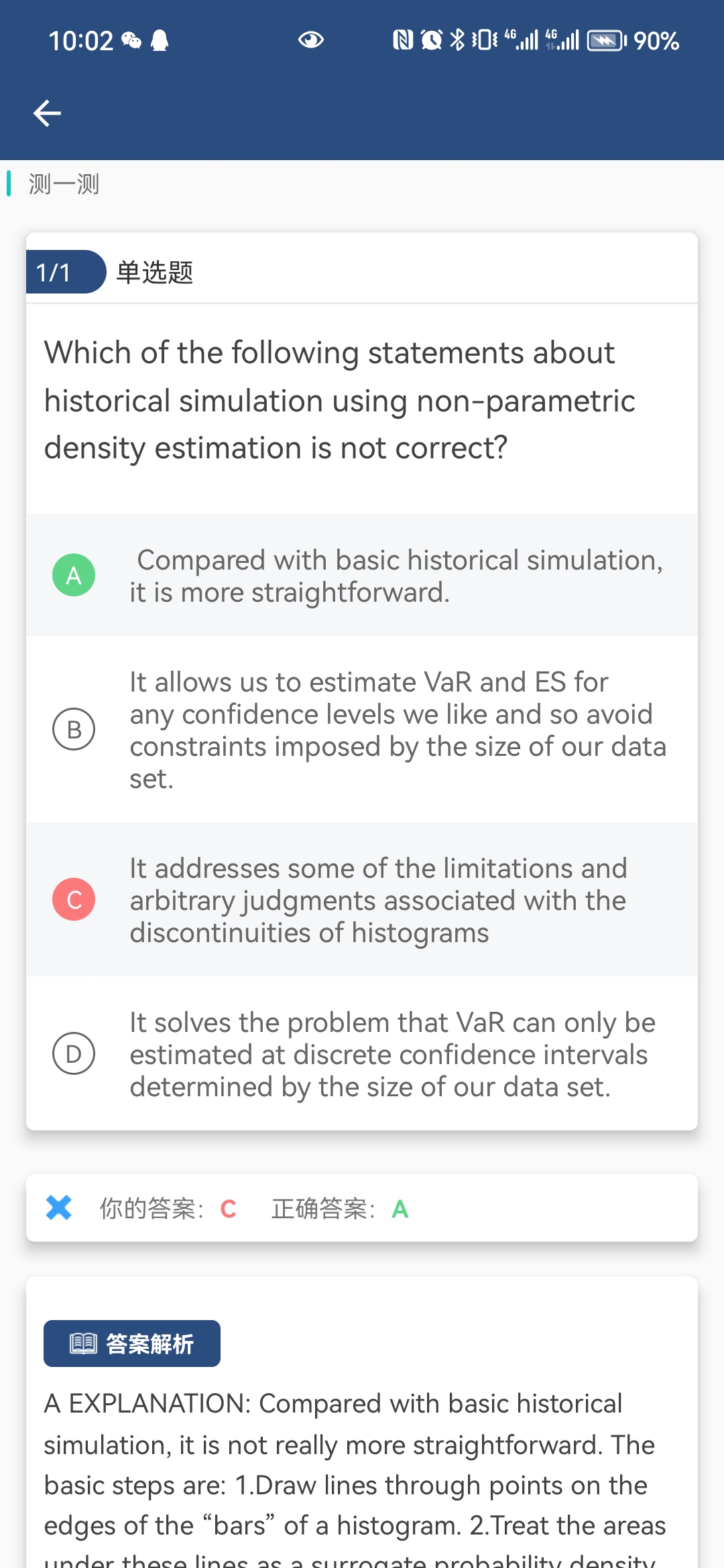 同学你好,非参概率密度估计法的作用就是通过线性插值法把非参法中的历史模拟法的离散点直方图中的折线图变成了连续分布图,解决了历史模拟法中不存在对应细小分位点数据的情况。所以C选项说法说的完全正确。
