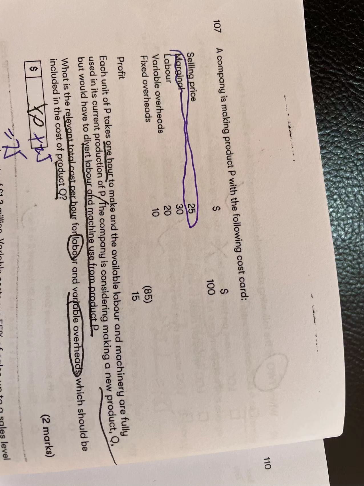 同学,你可以将marginal看成direct material,机会成本是产品P的contribution,contribution of P=selling price-VC=100-25-30-20=25。