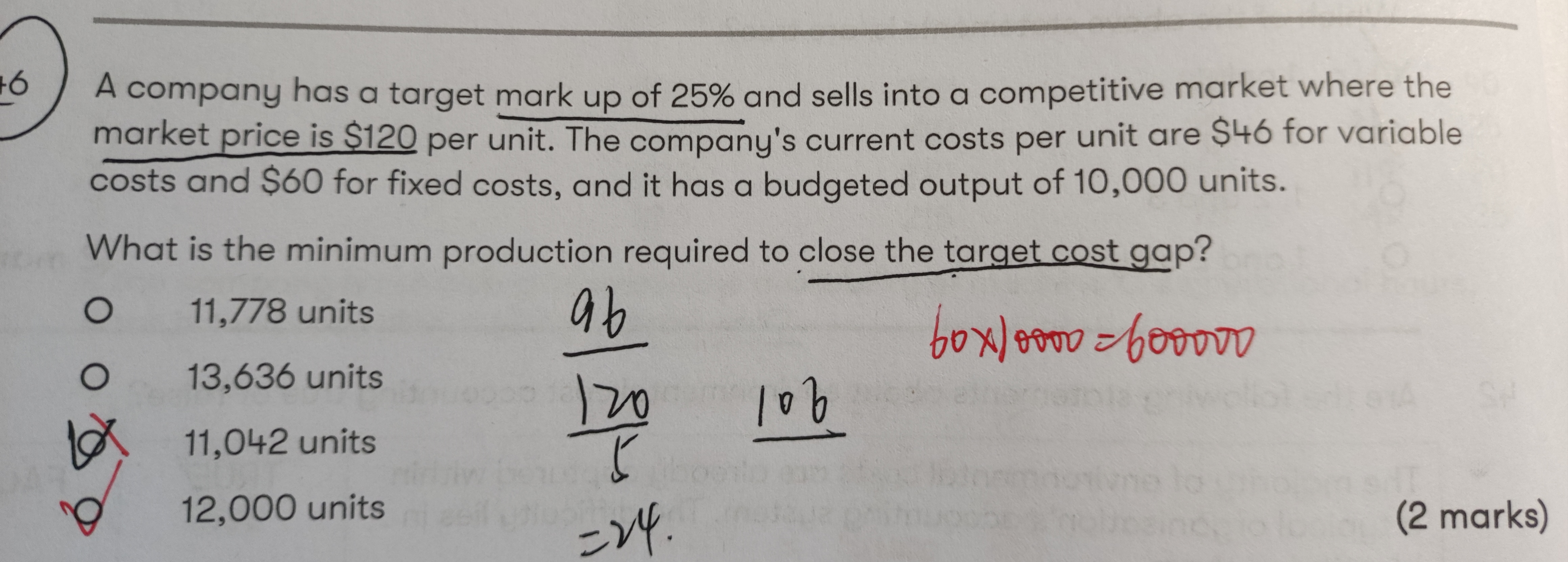 同学,题目描述想要目标利润是mark-up 25%,market price已经给出是120,那么得出预期成本就要控制在96,但是目前的成本是46+60=106,需要降低,但是 VC per units 46是无法降低的,所以只能FC per unit降低到50,现在总的FC是10000*60=600000,降低到50就要增加生产量到600000/50=12000。
