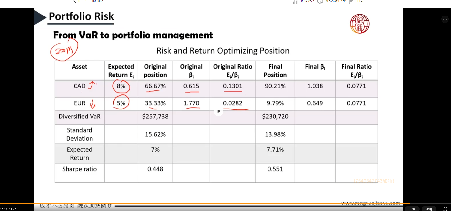 同学你好,因为Ei/βi代表风险调整后的收益,类似于特雷诺比率,所以是越大越好,又因为CAD的Ei/βi更大,所以应该加仓CAD,增加CAD的头寸会同时增加CAD在组合中的占比,而β又会受到权重的影响,所以β也会增大。