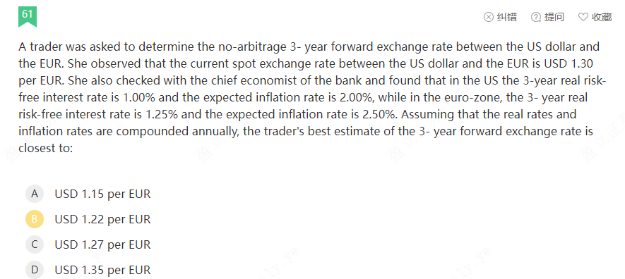 同学你好,这道题考察的是远期汇率的计算,利用公式F=S*(1+RD)^t/(1+RF)^t,这不过这里的利率考虑了通货膨胀率,即R=Rf+通胀率。