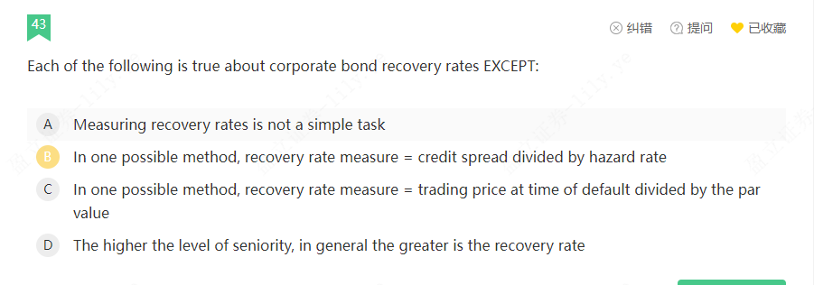 同学你好,这道题考察的是信用风险损失的计算公式=风险敞口(EAD)*违约概率(PD)*违约损失率(LGD),只不过这道题考察的是这个公式的变形,即信用风险损失由金额的形式变成百分比的形式,即spread,此时违约敞口为1,同时违约概率也可以用hazard rate表示,所以公式就变成了spread=1*hazard rate*LGD,这个知识点在估值与风险模型中会涉及,先做了解。