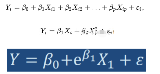 同学你好,线性回归中线性的含义: 因变量y对于未知的回归系数(β0,β1 .... βk) 是线性的,即参数线性。 换句话说只要系数β是线性的就称为线性回归,方程一和方程二中的回归系数β都是线性的,而方程三中自变量X1的回归系数为非线性,因此,方程一和方程二为线性回归,方程三为非线性回归。 这个问题弄错的原因是,大家把“线性回归方程”等价于“线性函数”。如方程二,出现了二次方,它是非线性函数 ,但是根据线性回归中对线性的定义,它是线性回归方程! 因此 线性函数 ≠ 线性回归方程 ,两者的概念不一样。方程一、二、三参考图片(从上到下依次为方程一、二、三)