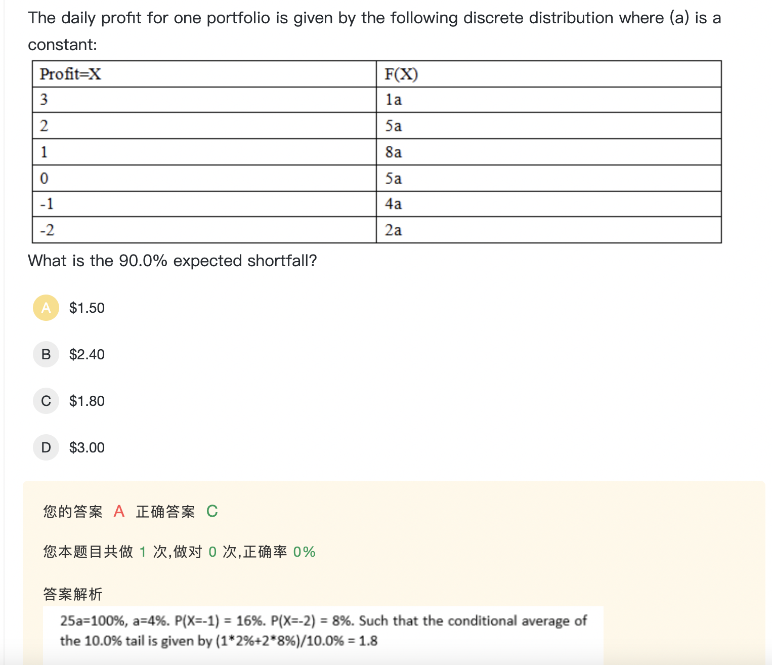 同学你好,这道题就是让计算离散型损失数据的ES,方法就是先计算出来每个离散数据对应的概率,然后加权平均,经过计算a=4%,所以,10%的ES,其中最大损失-2所占的概率为2a=8%,剩余的2%分给了第二大损失-1,所以最终的ES就是-2*8%+(-1)*2%=-1.8.