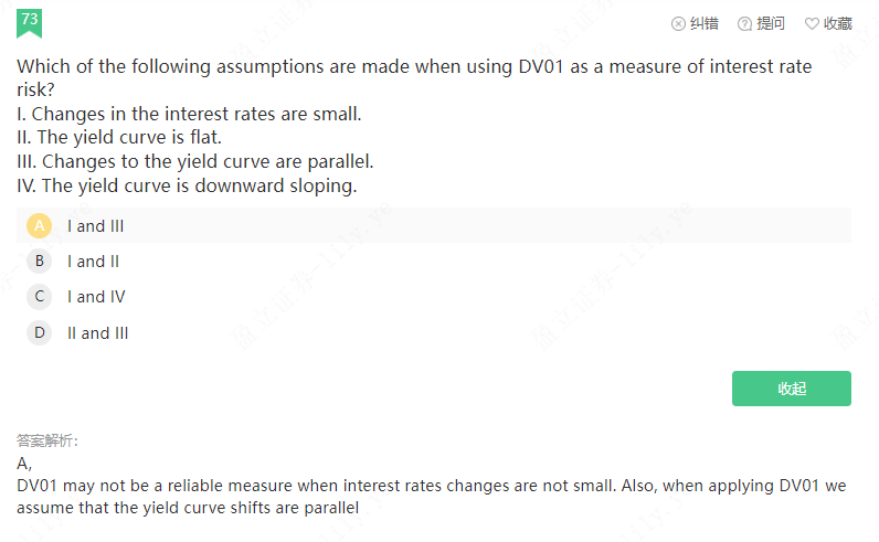 同学你好,DV01代表的是当利率变动一个基点(变化很小)时候对债券价格的影响;而且也是基于利率曲线平行移动的情况,也就是利率变动一个基点针对的是所有期限的利率都变动一个基点;至于利率曲线的形状是平的还是向上或者向下倾斜都不是DV01假设所关心的问题。