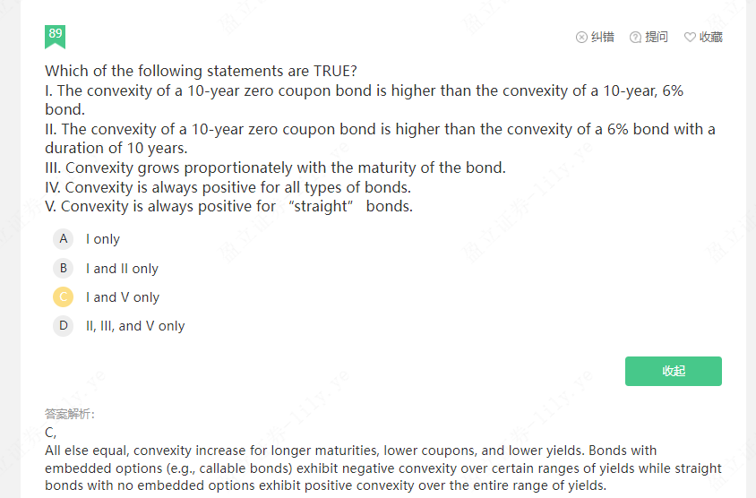 同学你好,straight” bonds即普通债券的意思,通常不包括含权债,对于不含权债券而言,凸度都是正数,而含权债全的凸度有可能为负数(比如callable bond),所以第四个说法错误第五个说法正确;一般情况下,久期越大,凸度也越大,所以第一个说法正确;但是并不是随着久期的增加呈比例的增加(而是非线性的增加),所以第三个说法错误;久期相同的情况下,现金流越大,凸度越大,所以第二个说法错误。