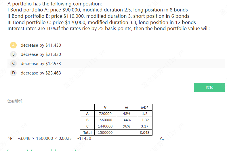 同学你好,因为组合中的债券B时一个空头头寸,所以当利率上涨时债券价格下跌导致组合的整体价值下跌,所以是一个负向的影响,体现在权重上也是负数。
