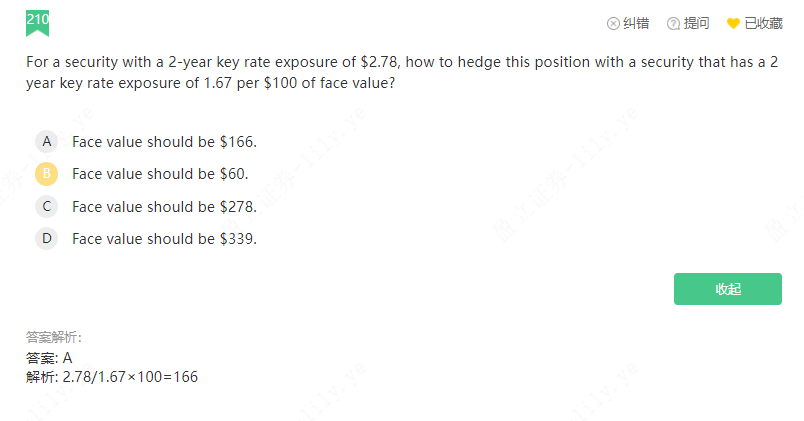 同学你好,这道题考察的是使用关键利率对冲工具(100面值的key rate 等于1.67的敞口工具,所以一美元的key rate 等于1.67的工具敞口为1.67/100)对现有敞口(key rate为2.78的敞口)进行对冲,问需要多少面值的对冲工具,所以用现有key rate 敞口2.78除以一美元的key rate 敞口,就是对冲工具key rate为2.78的面值金额。