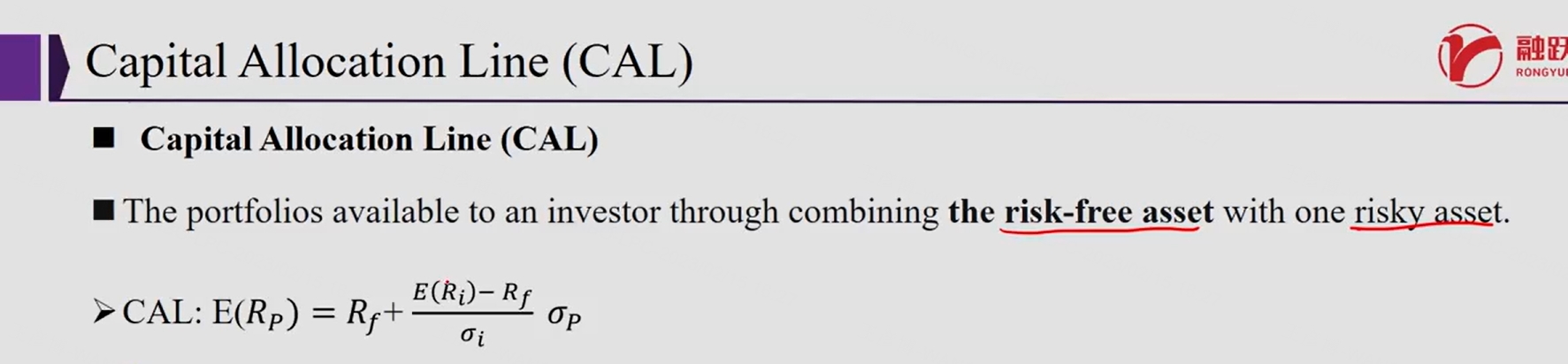 同学你好,E(Rp)代表组合的预期收益,Rf无风险资产的无风险收益率,E(Ri)代表资产i的预期回报率,西格玛i代表资产i的标准差,西格玛P代表组合P的标准差。
