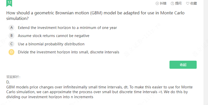 同学你好,几何布朗运动一般都是设置一个非常小的时间间隔,而且是服从正态分布的,所以A和C错,D对;另外股票价格不能为负数,所以服从对数正态分布,而股票收益率可以为负数(亏损时),所以B错;