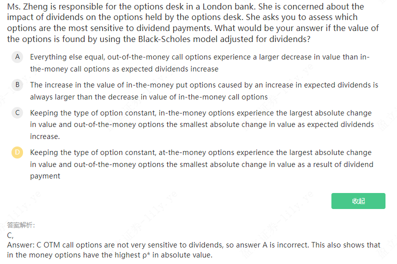 同学你好,分红影响标的资产价值,标的资产价值影响期权价值(其影响因素就是delta,取值为-1到1),各选项问的都是分红的影响程度,并没有方向的判断,又因为delta的绝对值大小就代表其影响程度,所以只需要判断各选项中delta的绝对值大小就可以做出判断,参考图片理解。