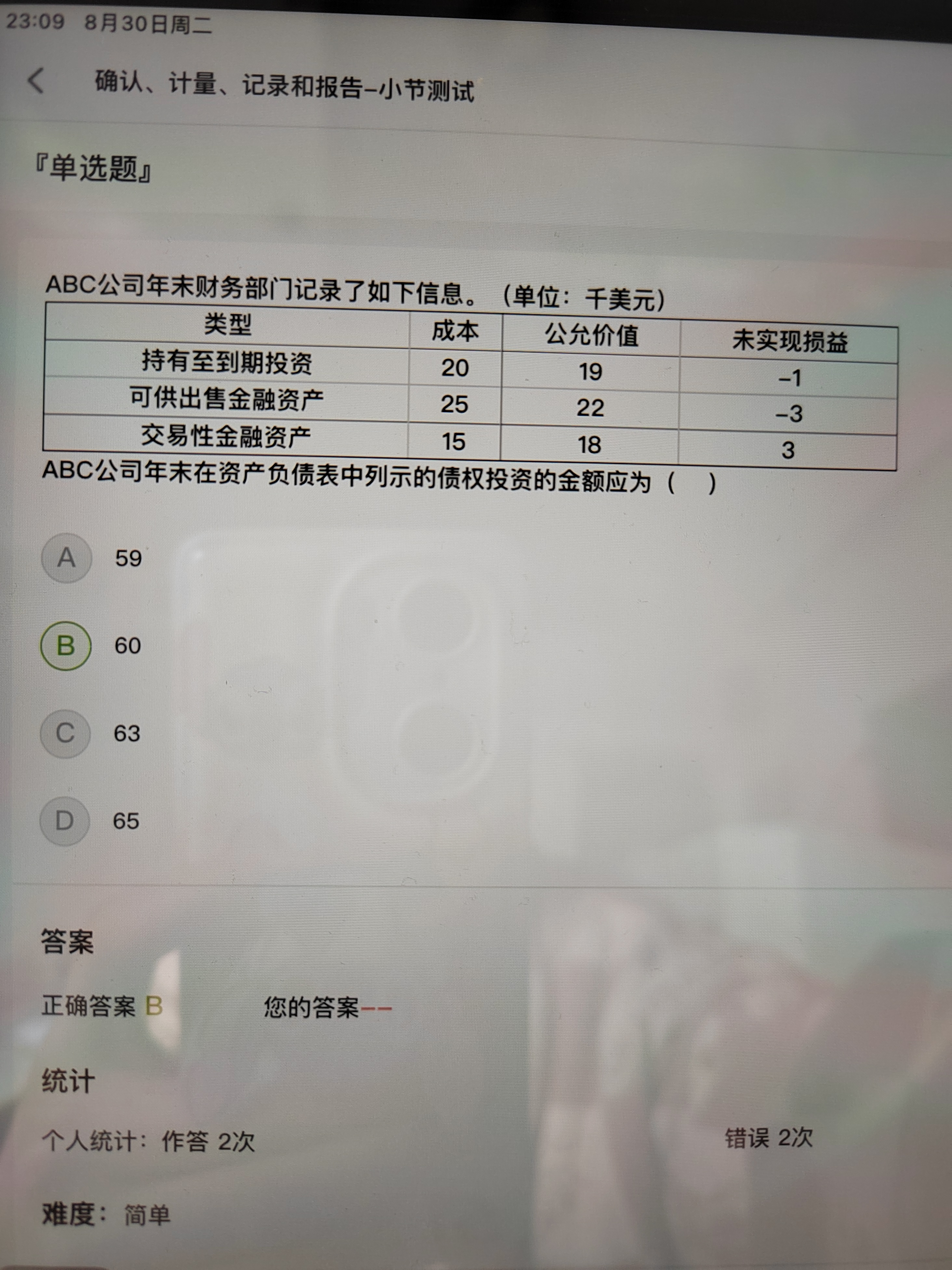 同学你好,可供出售金融资产与交易性金融资产公允价值发生变化的时候,账面价值做相应的调整,交易性金融资产涉及科目“交易性金融资产-公允价值变动”、“公允价值变动损益”。可供出售金融资产涉及科目“可供出售金融资产——公允价值变动”、“其他综合收益”。持有至到期投资以摊余成本计量,公允价值变动不显示。所以题目中:持有至到期投资20+可供出售金融资产22+交易性金融资产18=60。
