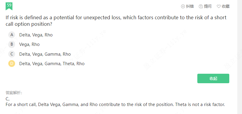 同学你好,因为题干中提到的关键词是非预期损失,而thea作为期权价格对时间的敏感程度衡量指标,因为时间是一个可以预期的因素,所以并不符合题意。