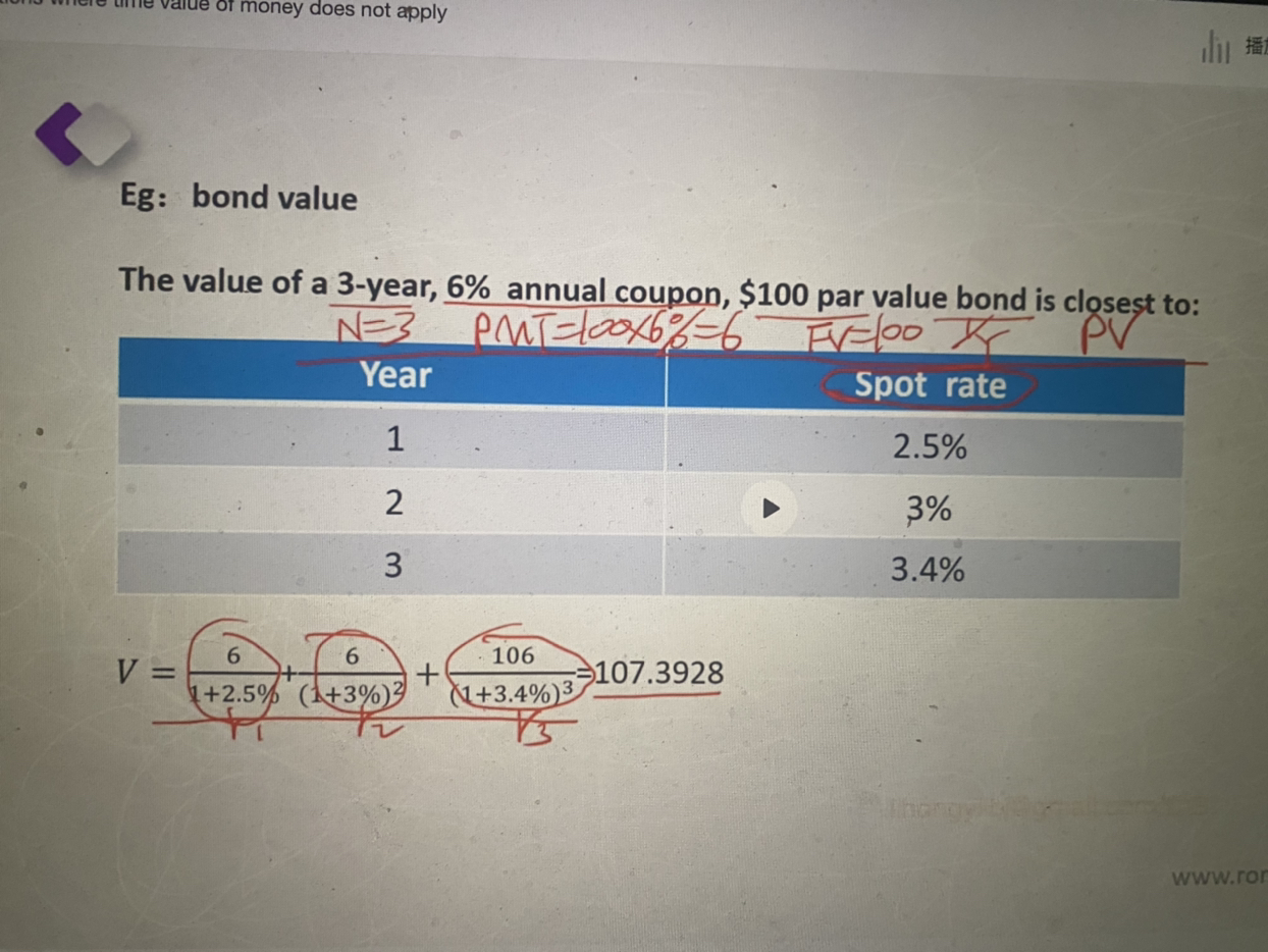 同学你好,因为第三年年末会受到本金100和票息6,所以总共是106
