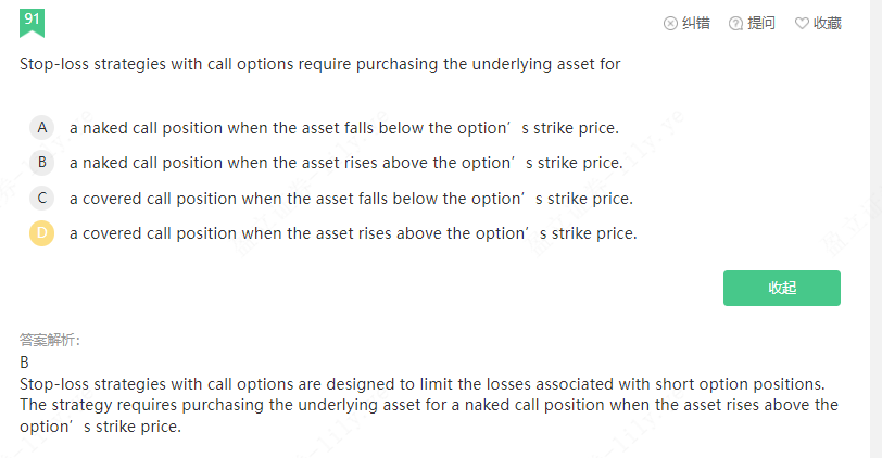同学你好,这道关键是要读懂题目的意思,题干的意思是说在什么样的情况下需要买入一个标的资产来对冲看涨期权亏损的风险,试想一下,什么情况下看涨期权会发生亏损,如果是看涨期权的买方,当股价上涨时是赚钱的,只有当股价下跌时才会亏钱,当时此时买入股票亏损就更大了,起不到止损的目的,所以不符合题意,只能是指看涨期权的卖方,而对于看涨期权的卖方什么情况下会产生亏损,是不是只有当股价上涨的时候,看涨期权的买方行权会产生亏损,此时如果看涨期权的卖方只有一个裸的看涨期权(卖方)岂不是很危险,所以此时需要通过买入一个标的资产来获取价格上涨的收益来对冲风险。所以,只有B符合题意,对于coverde call 而言当股价上涨时是赚钱的。