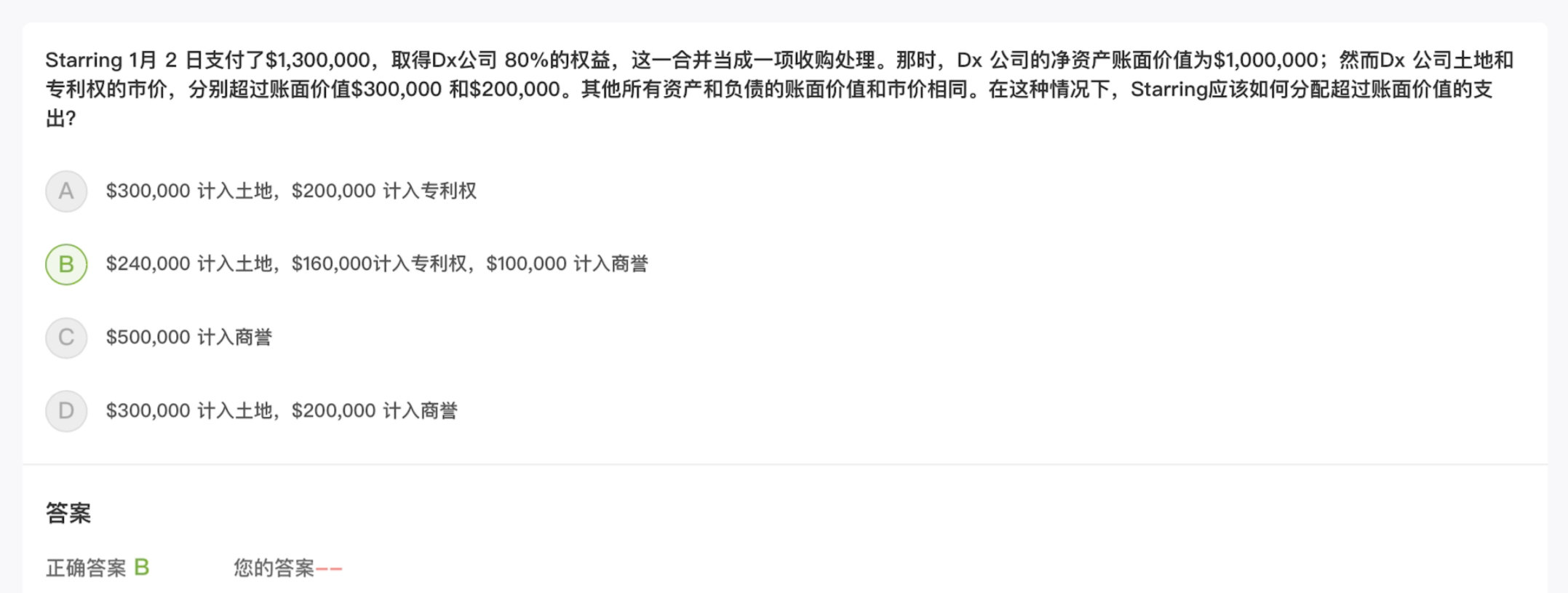 同学你好,因为Starring收购Dx公司80%的股权,所以Dx公司净资产账面价值100万时,Starring占比80万美元,可Starring收购支付对价130万美元,多出来的50万美元。就是市价超过账面的资产,土地多出来30万美元,Starring占据24万美元(30万美元的80%)。专利权20万美元,Starring占据16万美元。50-24-26=10万美元即为商誉。
