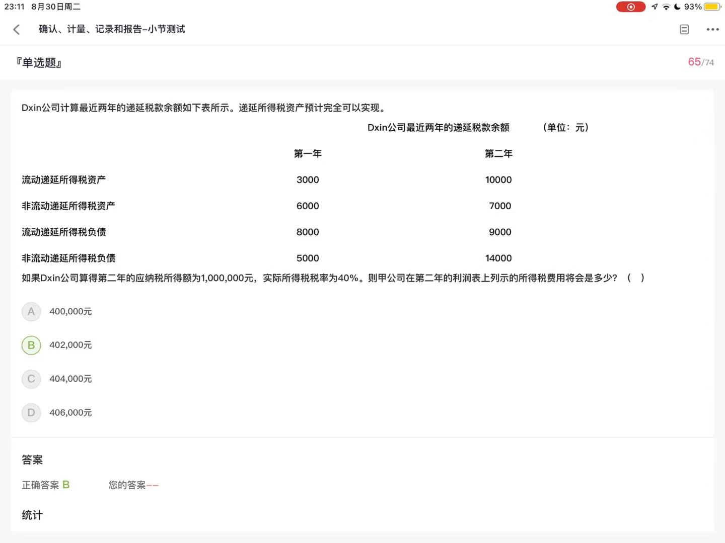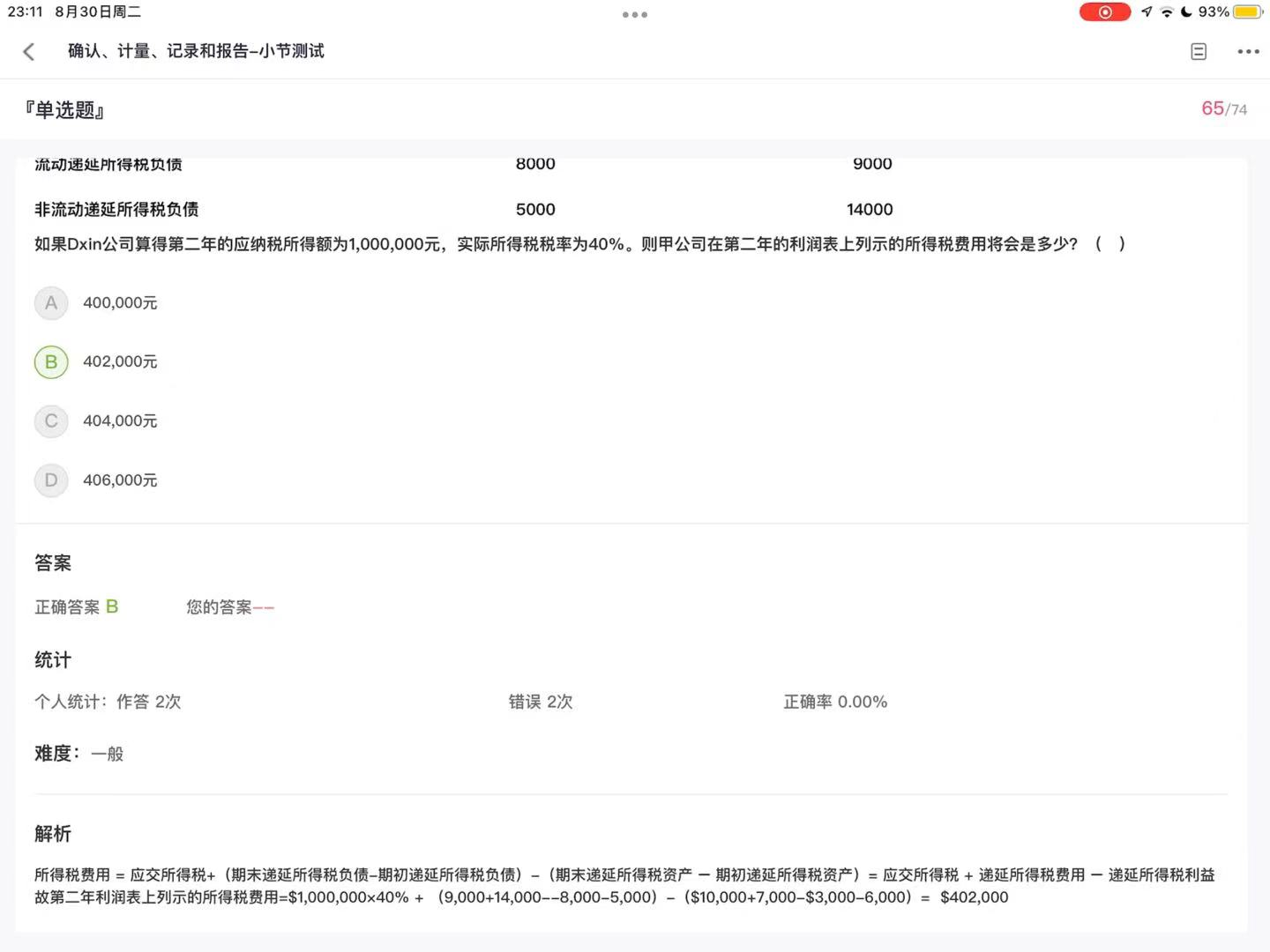 同学你好,所以在计算第二年所得税费用的时候,用的是增加额。所得税费用=应交所得税+递延所得税负债增加额-递延所得税资产增加额。所得税费用=100×40%+(9000-8000+14000-5000)-(10000-3000+7000-6000)=402000元。