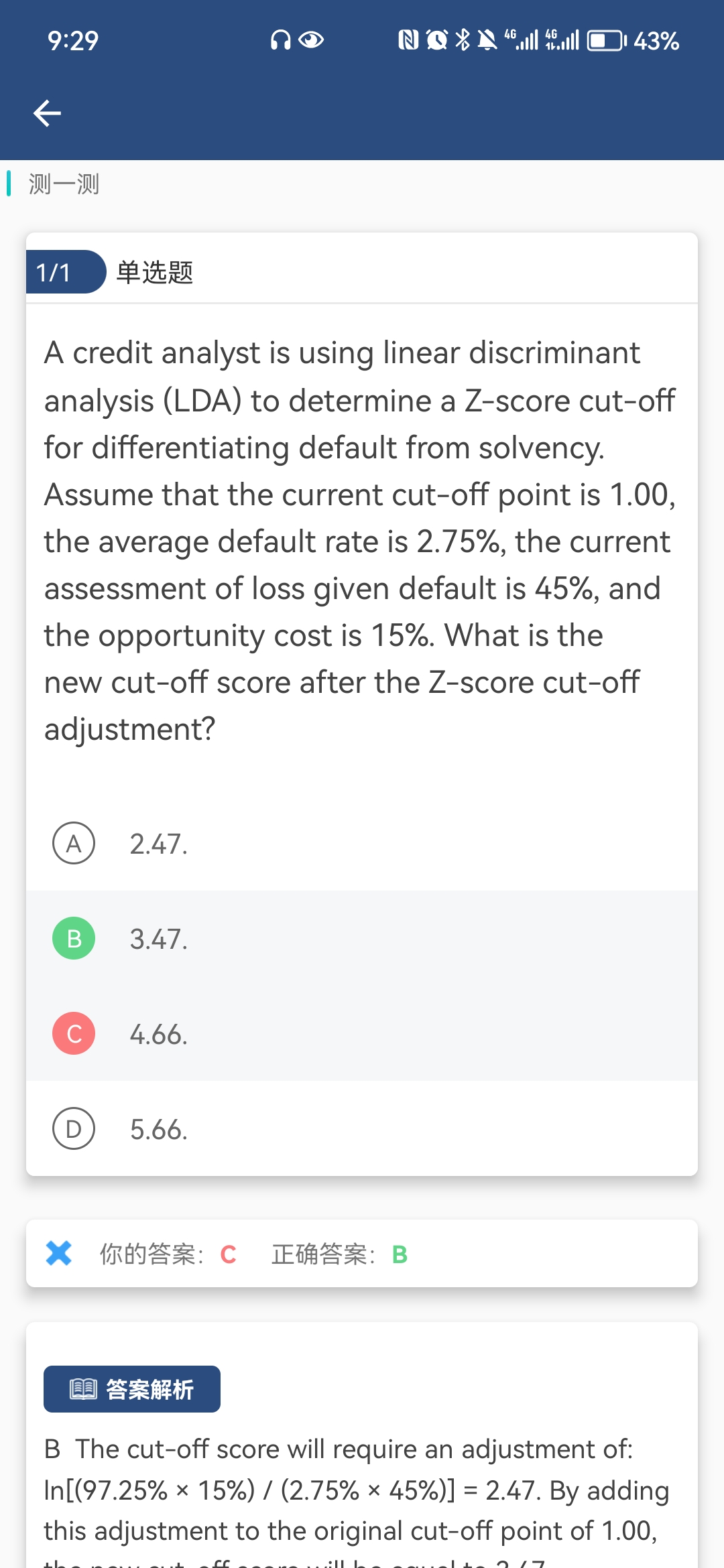 同学你好,这道题是关于LDA方法的相关计算,在实务中,在计算出来LDA的理论值后(就是题目中的当前cutoff)需要进行校对,校对因子计算公式就是解析中的ln(生存概率*机会成本率/违约概率*违约损失率),最终的 Z-score cut-off adjustment就是当前的cut-off值加上调整因子,了解即可,不要求掌握。