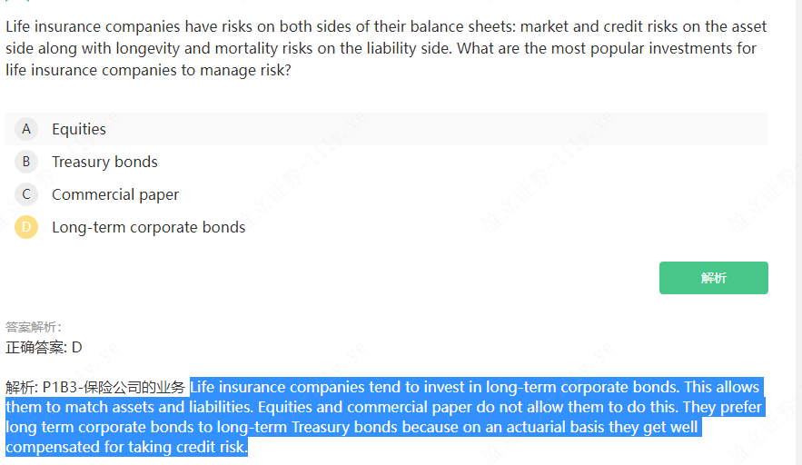 同学你好,首先,保险公司种的寿险产品的风险是经过精算的,死亡凤霞一般都是由时间规律的,都是长期风险,即投保人死亡时需要由现金流顶上,此时就需要提前买入一些期限匹配的固收类产品到期受到现金流,又因为国债虽然安全但是收益也较低,所以一般都是购买一些优质的公司债。