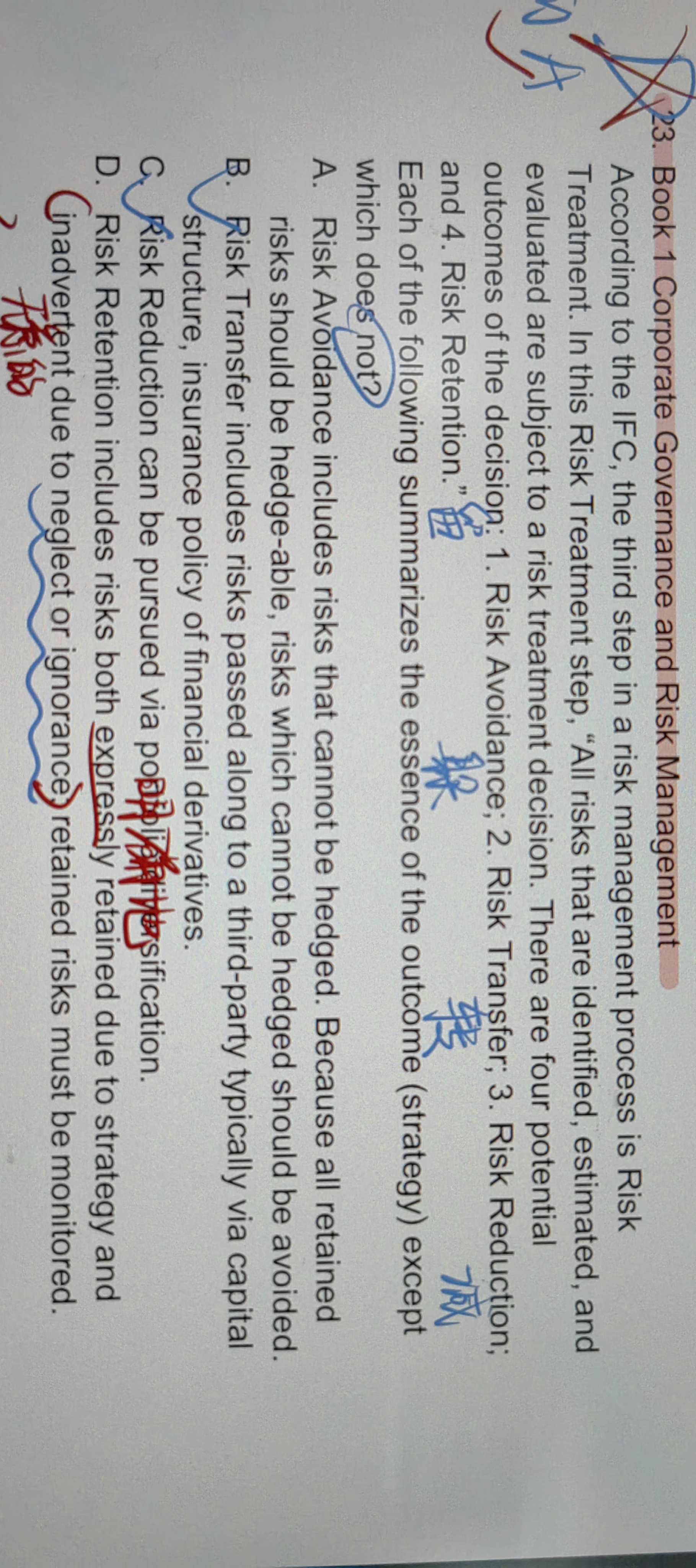 同学你好,A选项说的是风险避免(不能被对冲或者不能承受的风险尽可能的要避免),D选项说的是风险保留(保留的风险一方面是因为想要获得其回报,另一方面是因为没有识别到混进来的,所以对保留的风险需要时刻监管),两者属于不同的策略。