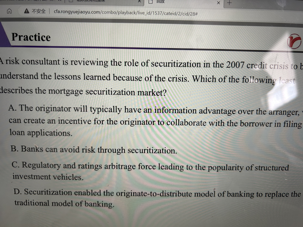 错误的答案应该是B选项,证券化只能说缓释银行承担的风险,但是无法做到完全规避。比如在次贷危机爆发以后,银行资产端可能还有很多没有剥离掉的不良资产,加上证券化已经出现了大问题,所以银行可能会面临到证券化失败的问题
