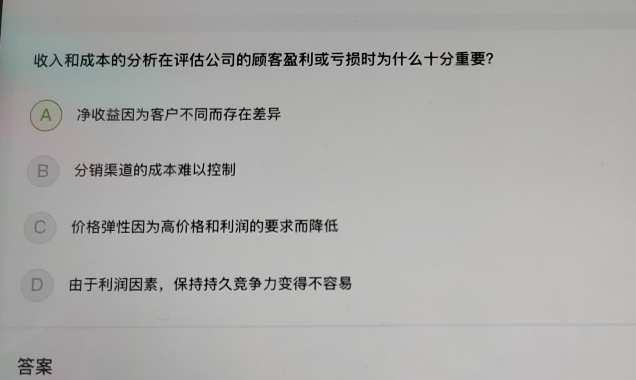 同学你好,题目问法换一下“为什么在评估公司的顾客盈利或亏损时收入和成本的分析是重要的”这样是不是在理解上好理解一些。不同的客户可能会产生大致相同的总销售量,但并不是所有销售收入都是相同的。公司的客户净收益可能会因各种因素而变化,如销售折扣、付款和交货条款、销售退货和津贴。