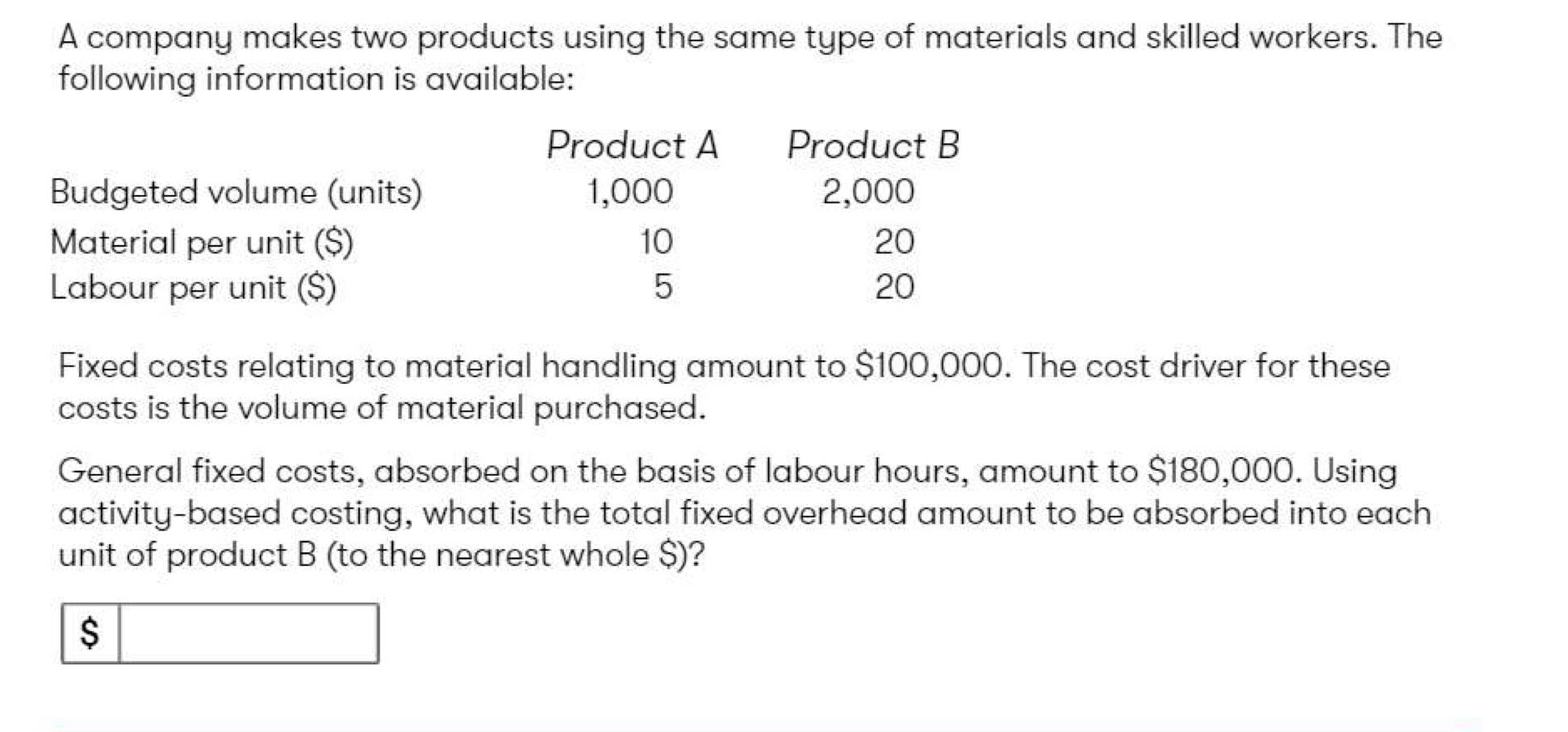 同学,Total material budget ((1,000 units x $10) + (2,000 units × $20)) = $50,000 Fixed costs related to material handling = $100,000 OAR = $2/$ of material Product B = $2 × $20 = $40 Total labour budget ((1,000 units × $5) + (2,000 units × $20) = $45,000 General fixed costs = $180,000 OAR = $4/$ of labour Product B = $4 × $20 = $80 Total fixed overhead cost per unit of Product B ($40 + $80) = $120.