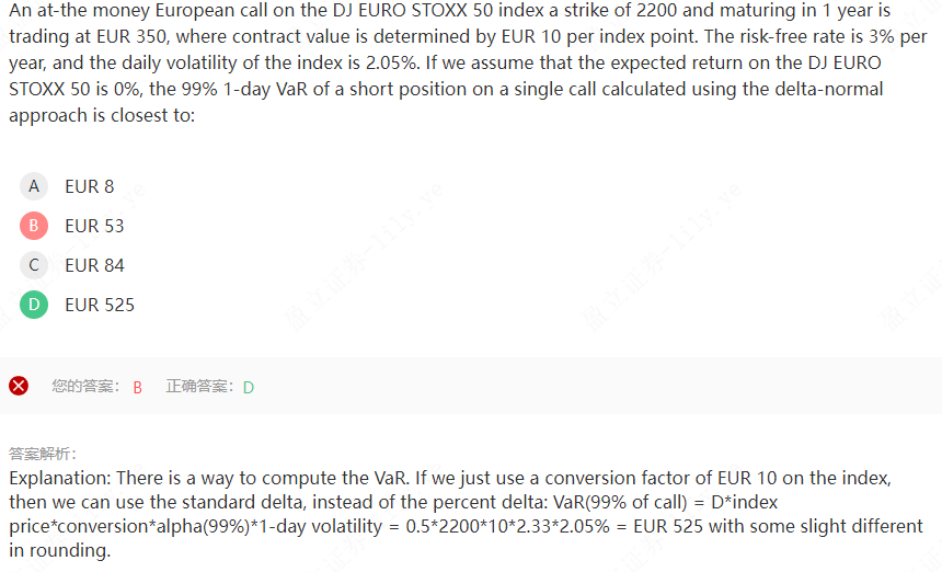 同学你好,这道题就是让利用delta-normal法计算期权的VAR值=Delta*P*Z*σ=0.5*(2200*10)*2.33*2.05%,关键是这里的标的资产指数的价格P是等于点位数2200乘以每个点位数对应的单价10欧元。