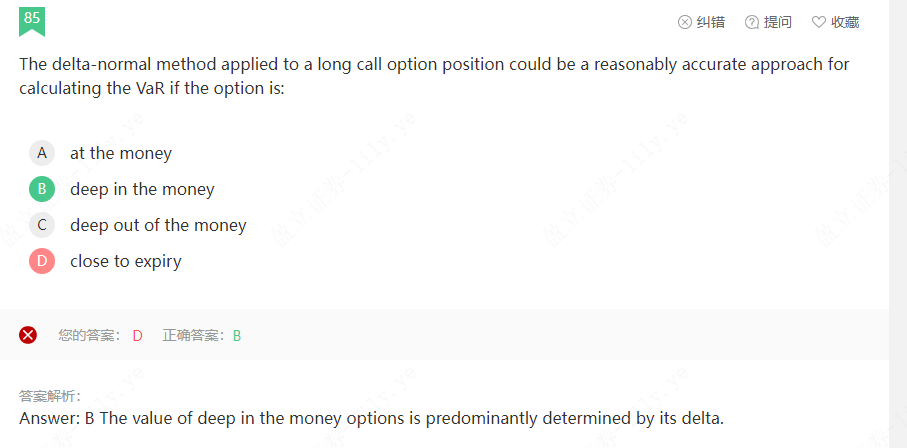 同学你好,因为当看涨期权处于深度价外时,其delta趋近于0,此时delta几乎没有任何解释作用,所以不选,而当处于深度价内时,其delta趋近于1, delta几乎可以完全解释,误差最小。