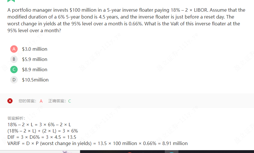 同学你好,这道题要求的是反向浮动利率债券的VaR值「=D*P*var(ds)」,P=100M,var(ds)=0.66%(相当于标的资产反向浮动利率债券的极端损失率),所以只需要再计算出反向浮动利率债券的久期就可以了,反向浮动利率债券(18%-2*LIBOR)可以拆解为3个固定利率为债券(3*6%)和两个浮动利率债券(2*L),又因为此时正好处于重置日之前,所以浮动利率债券的久期=0,所以最终反向浮动利率债券的久期就等于三个固定利率债券的久期3*4.5。
