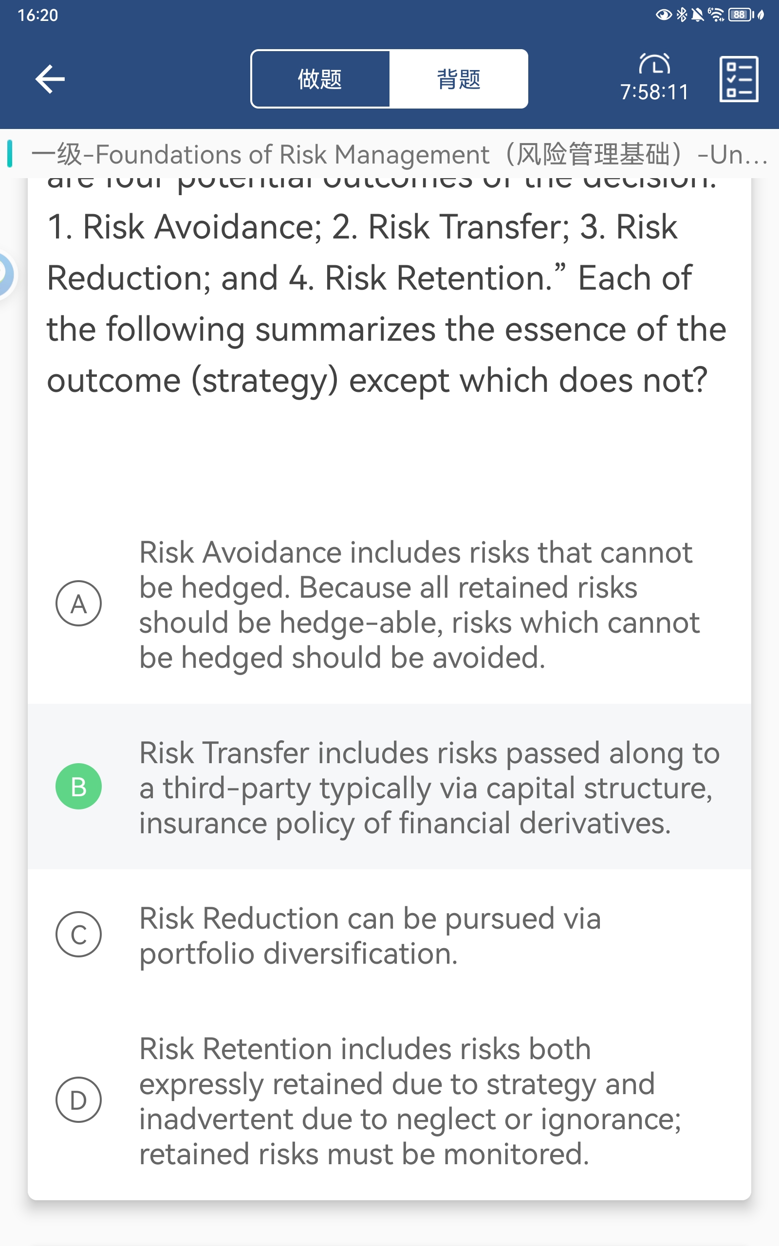 同学你好,B选项错在说风险转移可以通过资本结构,没有这种说法的。