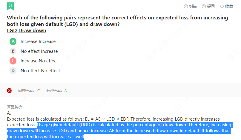 同学你好,draw down就是单纯提取的意思,Usage given default (UGD)是违约的情况下的使用率(提取率),比如银行发行一张信用卡,额度1完,已使用五千,到了还款日未还款叫违约,此时剩余的五千额度在原则上持卡人仍然可以使用,此时持卡人又把剩余的五千额度提现 了话,就是违约的情况下的使用率(提取率)即5000/10000=50%.