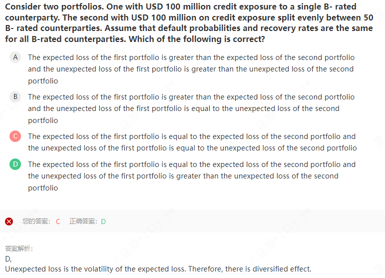 同学你好,UL=VaR-EL,而VaR=u-Z*σ,所以UL跟波动率有关,而组合的波动率跟资产资产的相关系数有关,多个资产的相关系数一般是小于1的,所以相比于只有一个对手方,多个对手方的组合VAR是更小的,也就是所谓的分散化效应,所以其UL更小。