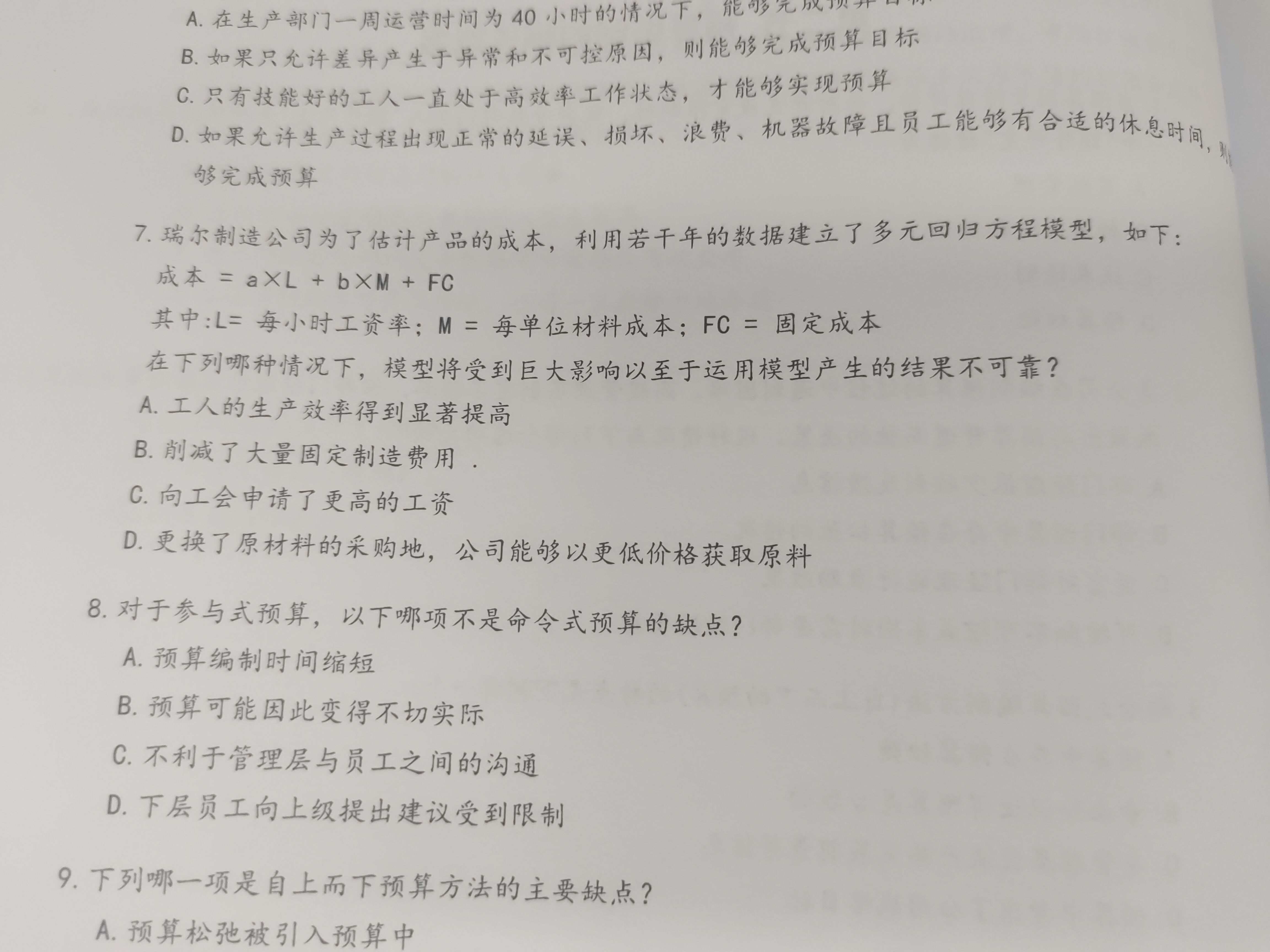 同学你好,在成本模型中,所有的固定成本、劳动力成本和原材料成本认为与产品是相关联的。只有单一变量才可以衡量对模型的影响。其他三个选项,削减大量固定制造费用,可能影响FC,更换了原材料的采购地,材料成本大幅下降,会影响M,向工会申请更高工资的问题,会影响L。而劳动生产率的变化会影响多个要素的变化,所以使模型无效。