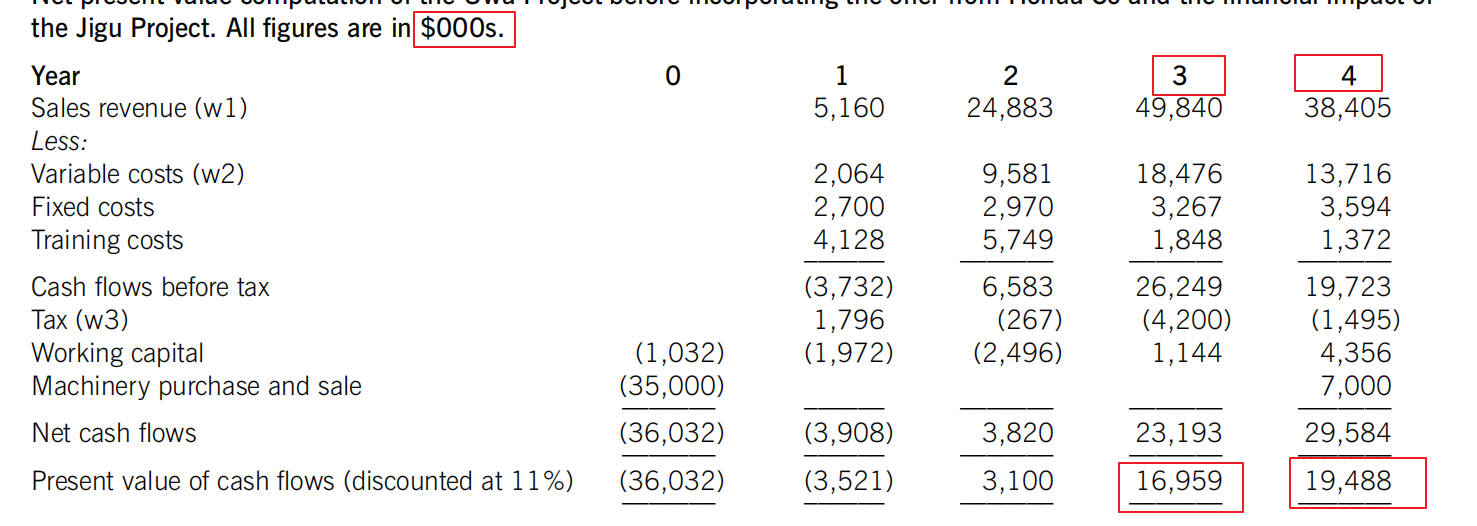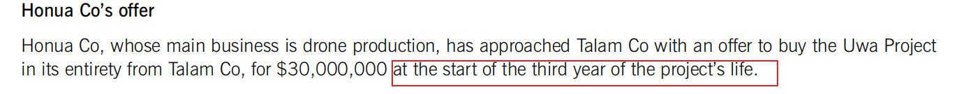 同学好,题干说T公司buy Uwa project 从项目的第三年开始购买,即Pa=第三年的NPV+第四年的NPV=16959k+19488k