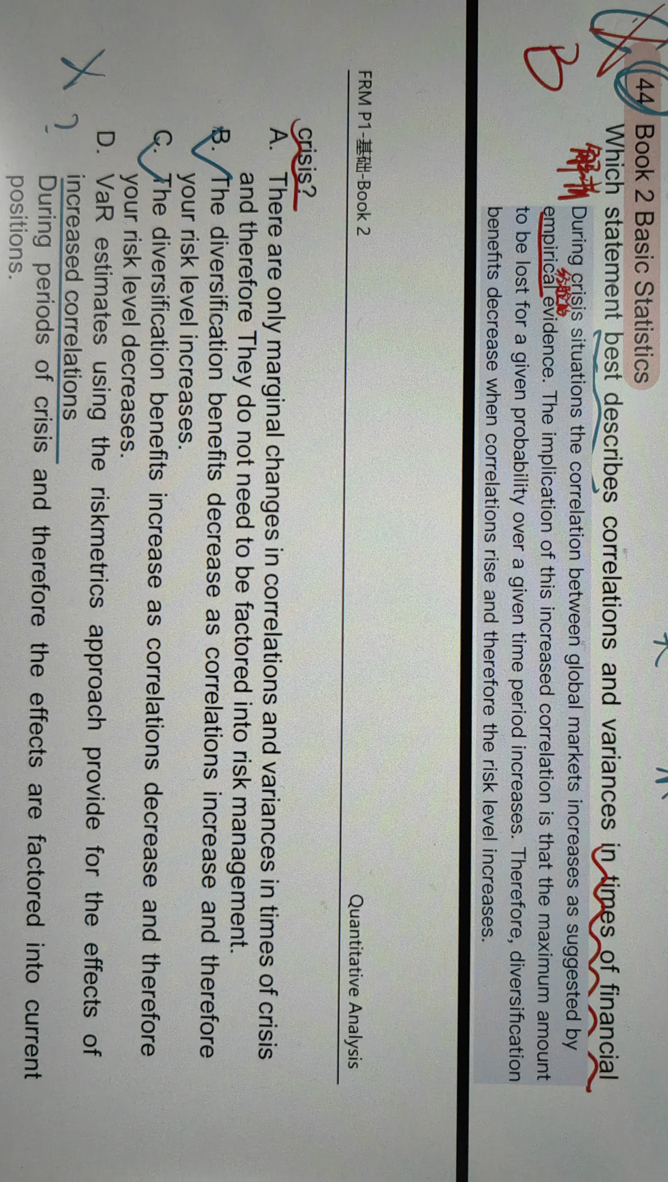 同学你好,题干中问的就是在金融危机中的方差和相关系数的表现,所以这是讨论的前提背景,而B选项的结论也是在金融危机背景下才得出来的,分散化好处只有在正常市场情况下才能得到,在金融危机中分散化的作用是很难体现出来的。