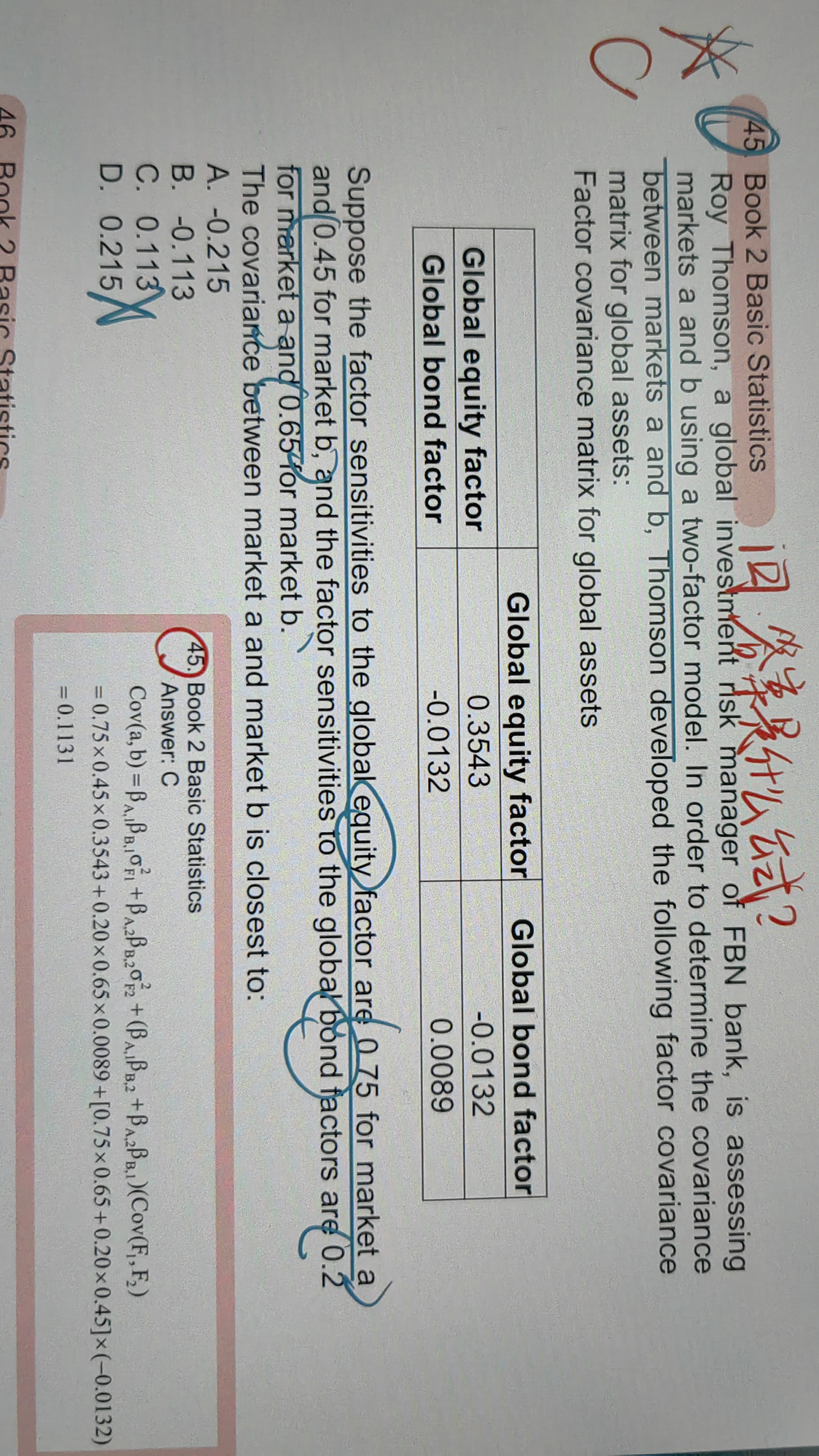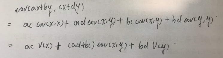 同学你好,这道题考察的是多项式的协方差公式,从题干背景可知,这道题让计算的就是cov(a,b),其中A=0.75x+0.2y,B=0.45x+0.65y,X和Y分别代表权益市场收益和债券市场收益,而cov(ax+by,cx+dy)=acV(x)+bdV(y)+(ad+bc)cov(x,y),if x and y are correlated.推导过程参考图片理解