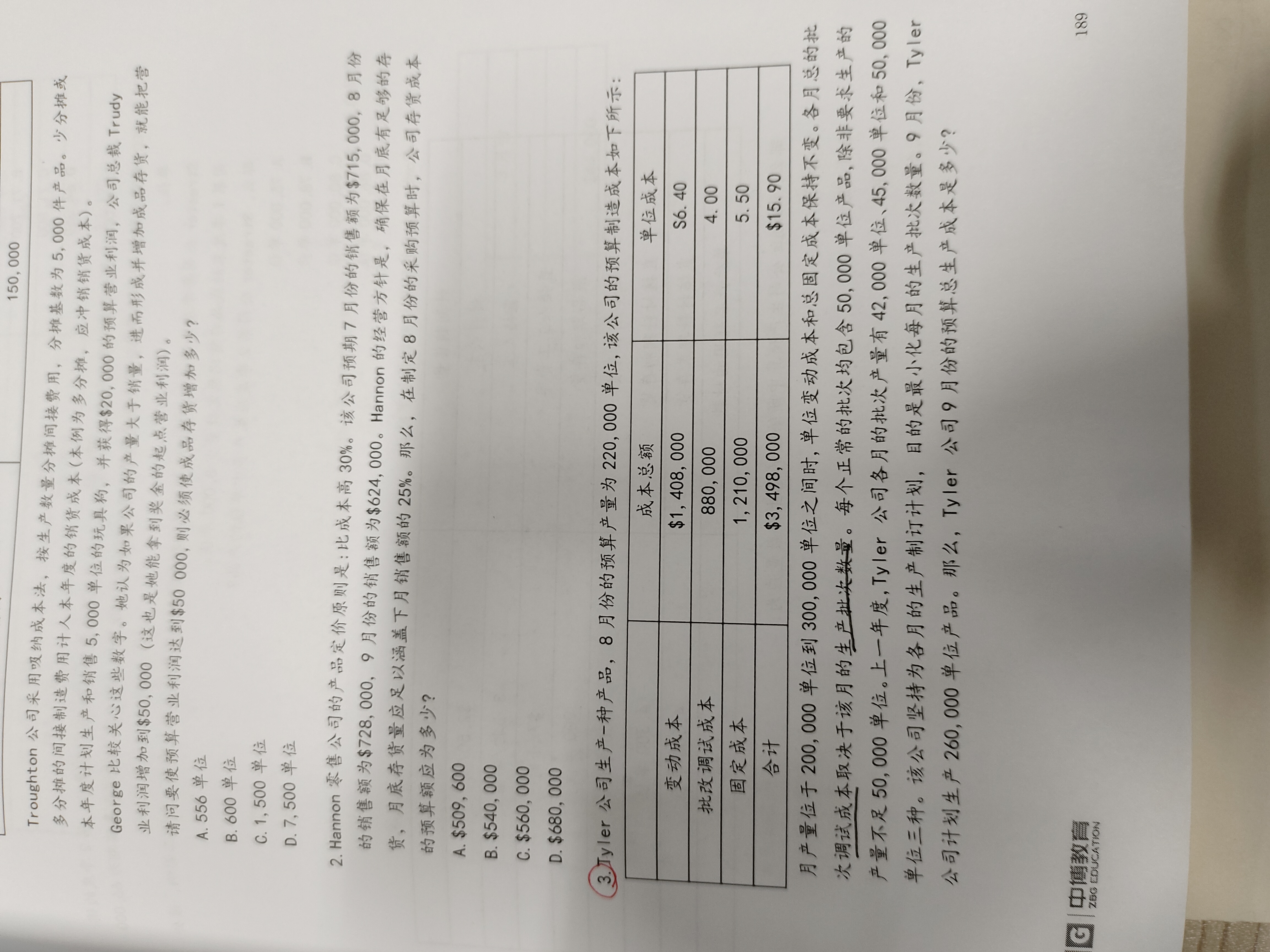9月份预算生产成本=固定成本+变动成本+批次处理成本。变动成本=1408000/220000×260000=1664000。批次处理成本:因为题干中写最小化生产批次数量,所以每一批次生产最大量。260000/50000=5.2,所以需要6批次。220000/50000=4.4,所以需要5批次,每批次成本=880000/5=176000,所以6批次成本=176000×6=1056000。9月份预算生产成本=1210000+1664000+1056000=3930000。