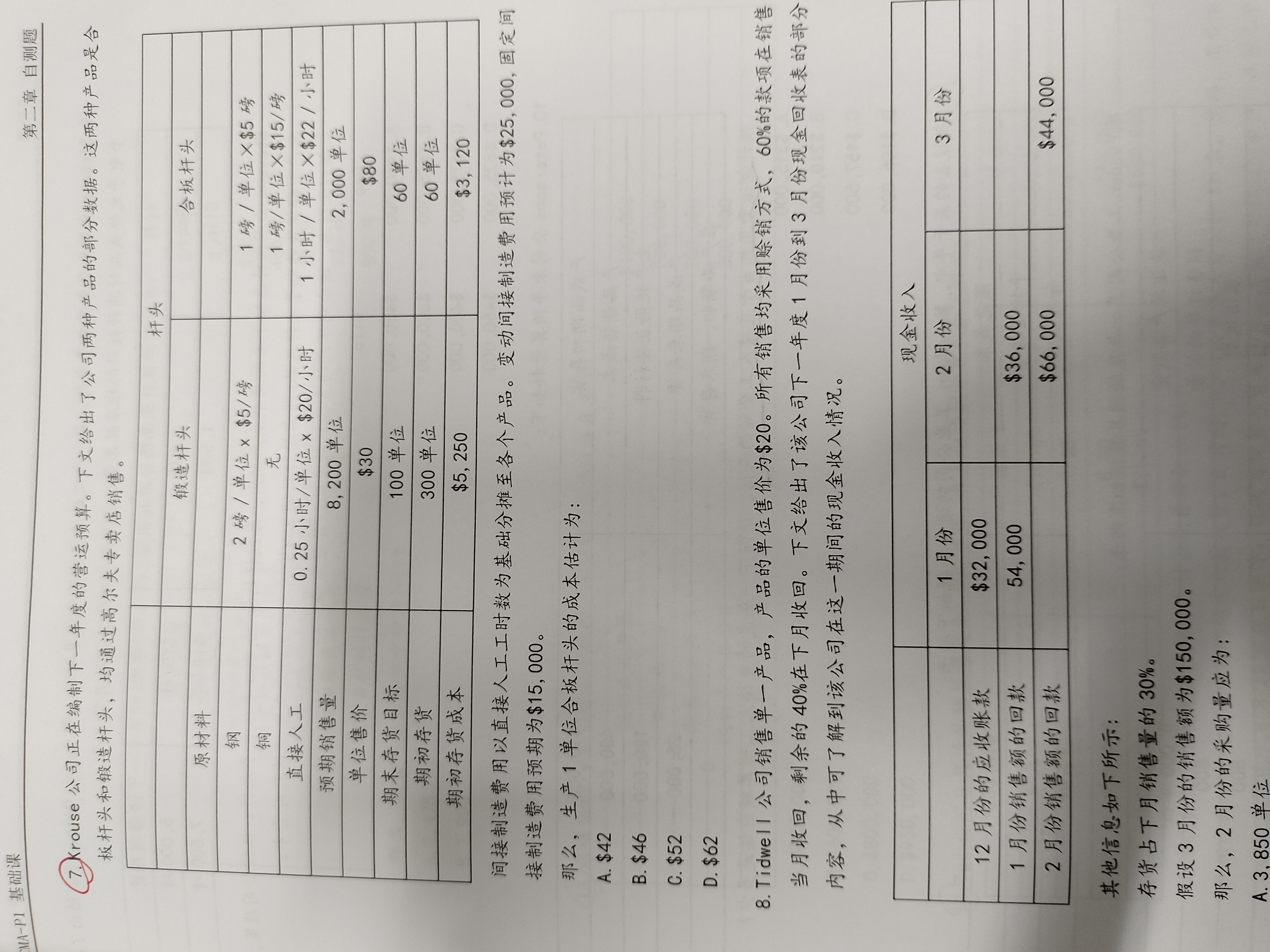 单位成本=直接材料+直接人工+制造费用。生产一单位需要花费的直接材料=铜加钢=5+15=20。直接人工=22。在计算制造费用的时候,因间接费用是用小时数分摊,我们首先需要计算小时数,锻造杆头:期初余额300,期末余额100,本期销售8200,所以本期生产=8200+100-300=8000.所以需要花费的小时数=8000×0.25=2000。合板杆头:期初余额60,期末余额60,本期销售2000,所以本期生产2000,所需花费的小时数=2000×1=2000。所以分摊到合板杆头的间接费用=(25000+15000)/4000×2000=20000.所以一单位合板杆头制造费用=20000/2000=10.所以一单位成本=20+22+10=52